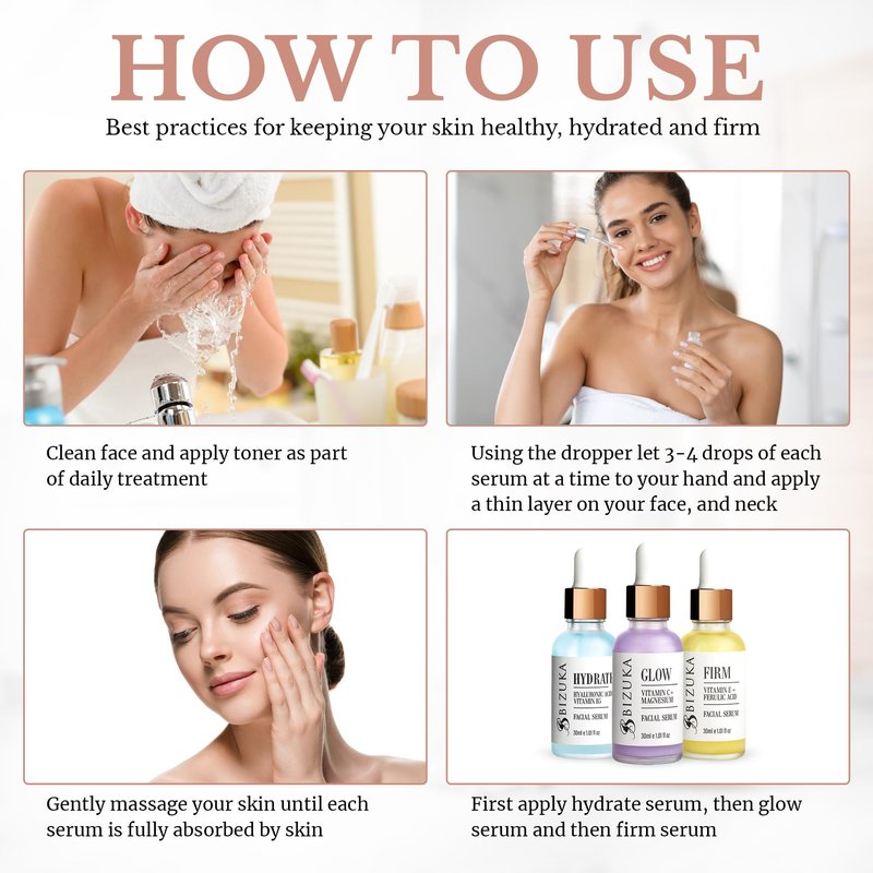 ➤ This set has everything you need to brighten, tighten & hydrate your skin, reduce dark spots, smooth, and hydrate the skin. Our bundle contains the top selling serums for your skin. Hydrate, glow and firm, 3 of 1oz bottles, all your skin needs as a treatment to reduce age fine lines and wrinkles. The BIZUKA face skin serum will help to avoid the appearance of age spots, and to maintain a soothing elasticity to the skin.