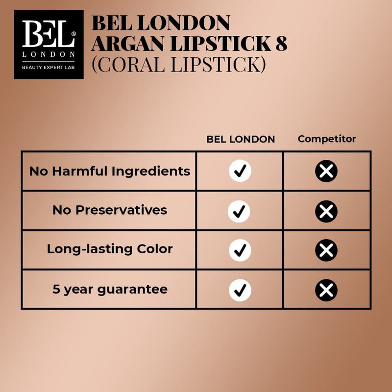 - GIVE YOURSELF A GORGEOUS FINISH: The different shades of BEL LONDON Argan makeup lipstick set provide you the best choice of a luxurious texture on your lips for a smooth-glide effect so you can complete your gorgeous appearance.