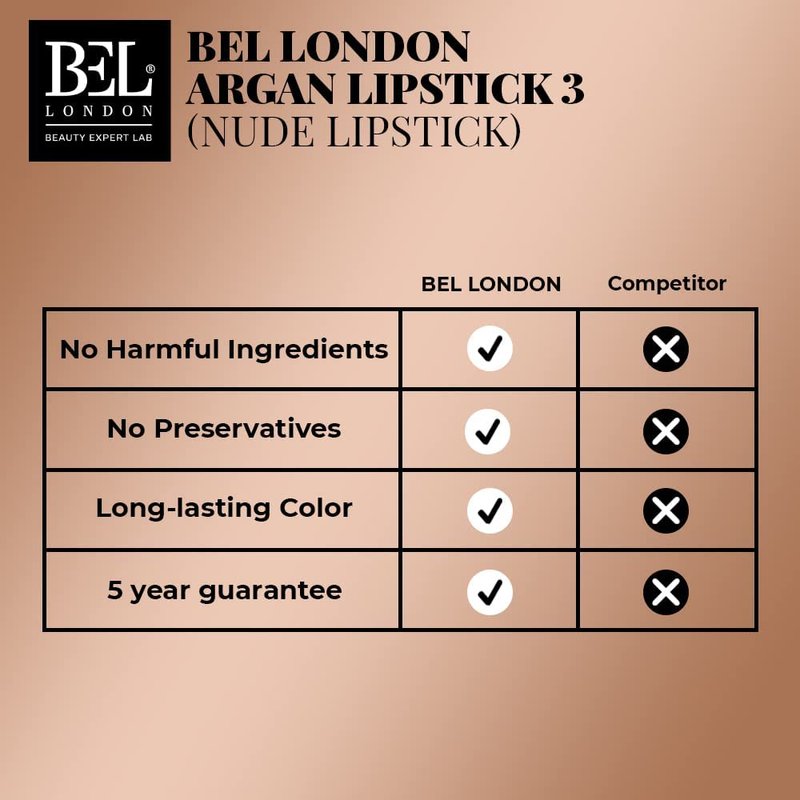 - NATURAL INGREDIENTS FOR LUSTFUL LIPS: Super-soft formula combines Argan, Camellia & Aloe Vera oil, vitamins, and antioxidants to deliver long-lasting comfort and cushioning. BEL LONDON argan oil lipstick is the perfect blend of beauty & care for healthy and seductive lips.