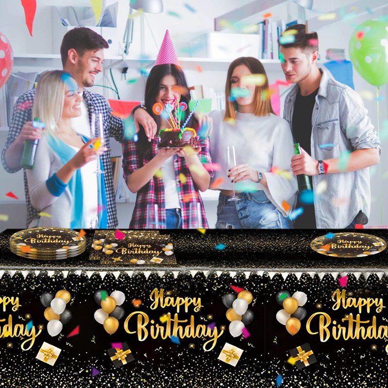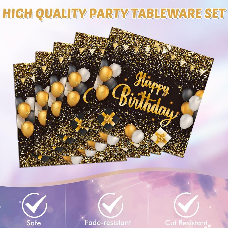 - You will get: this black and gold party decorations serve 20 guests, including 20 pcs Happy Birthday plates of 7 inch, 20 pcs Happy Birthday napkins, 1 pcs Happy Birthday Tablecloth,Their attractive and fashionable appearance and wide range of uses determine that they are a good gift choice for your friends, family, colleagues, etc