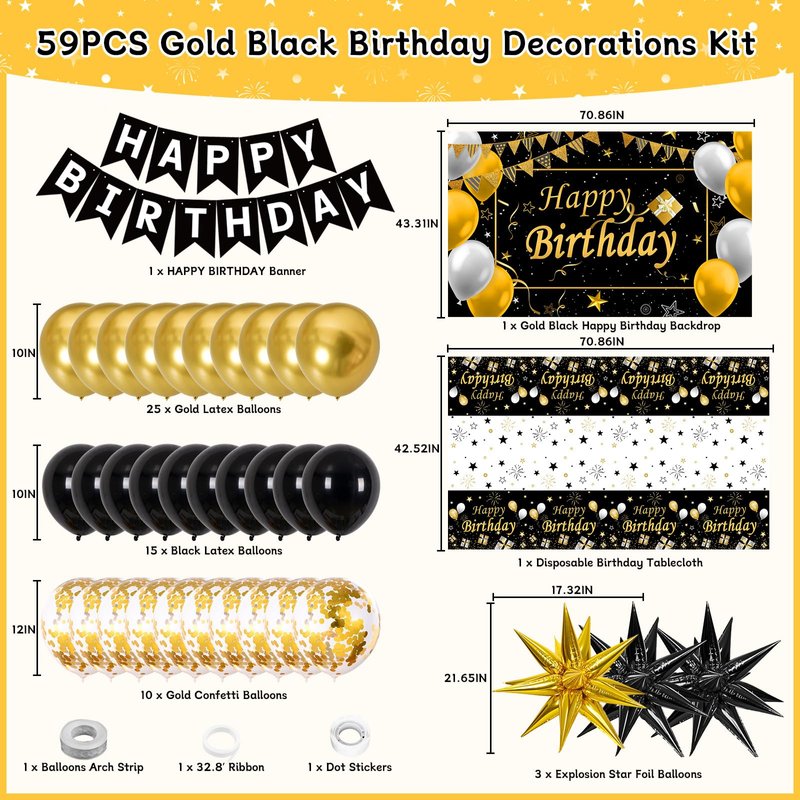 - 🖤Great Value Black and Gold Party Decorations Pack - The black and gold birthday decorations kit includes 1 x Happy Birthday backdrop, 1 x HAPPY BIRTHDAY banner, 1 x disposable birthday tablecloth, 3 x explosion star foil balloons(2pc gold + 1pc black), 25 x 10”gold balloons, 15 x 10” black balloons, 10 x 12” gold confetti balloons, 1 x balloon arch strip, 1 x dot stickers, 1 x ribbon.