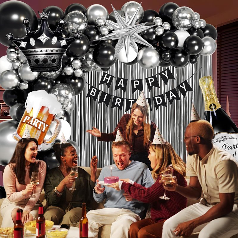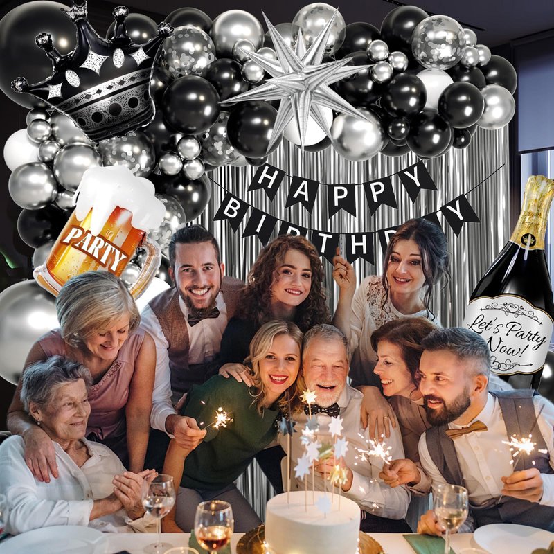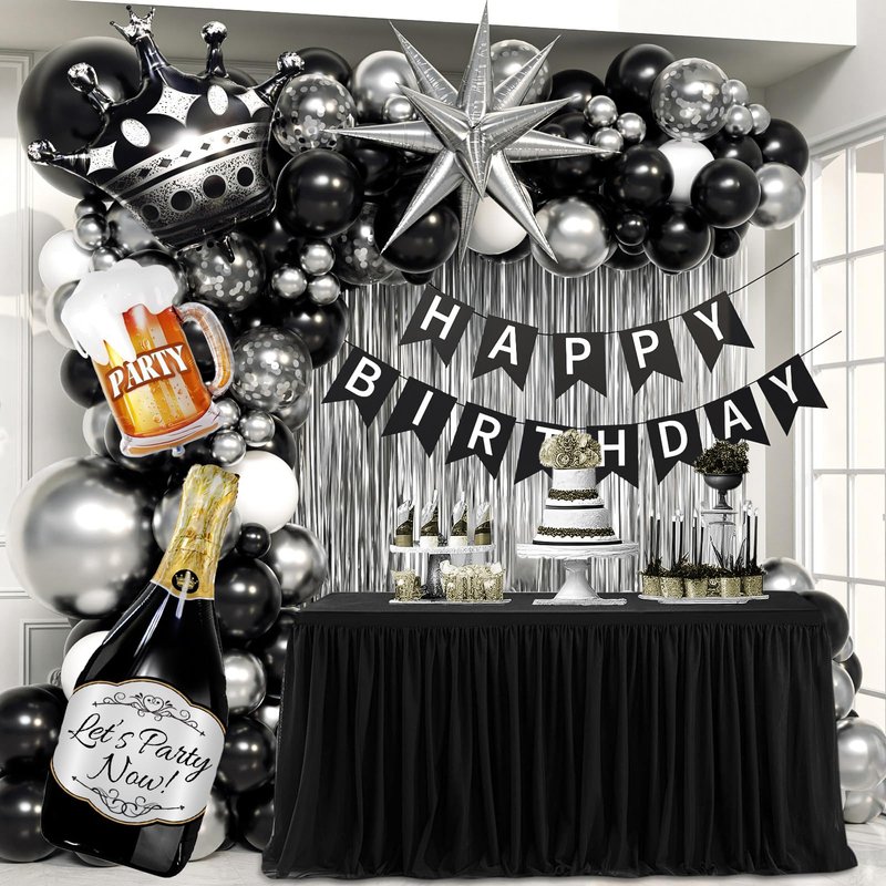 - Complete Party Set: This men birthday decorations set includes balloons, happy birthday banner, 2 fringe curtains, and foil balloons. The black and silver balloons with male themed foil balloons creates a mature atmosphere, faultless for your celebration