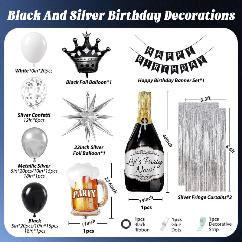 - Package Include: The black happy birthday decorations kit included 36pcs black balloons(18inchx1, 10inchx15, 5inchx20), 36pcs metallic silver balloons(18inchx1, 10inchx15, 5inchx20), 10inch white balloonsx20, 12inch silver confetti balloonsx6, foil balloonsx4, blue and silver happy birthday bannerx1, silver fringe curtainsx2, glue dotsx100, decorative stripx1, blue ribbonx1