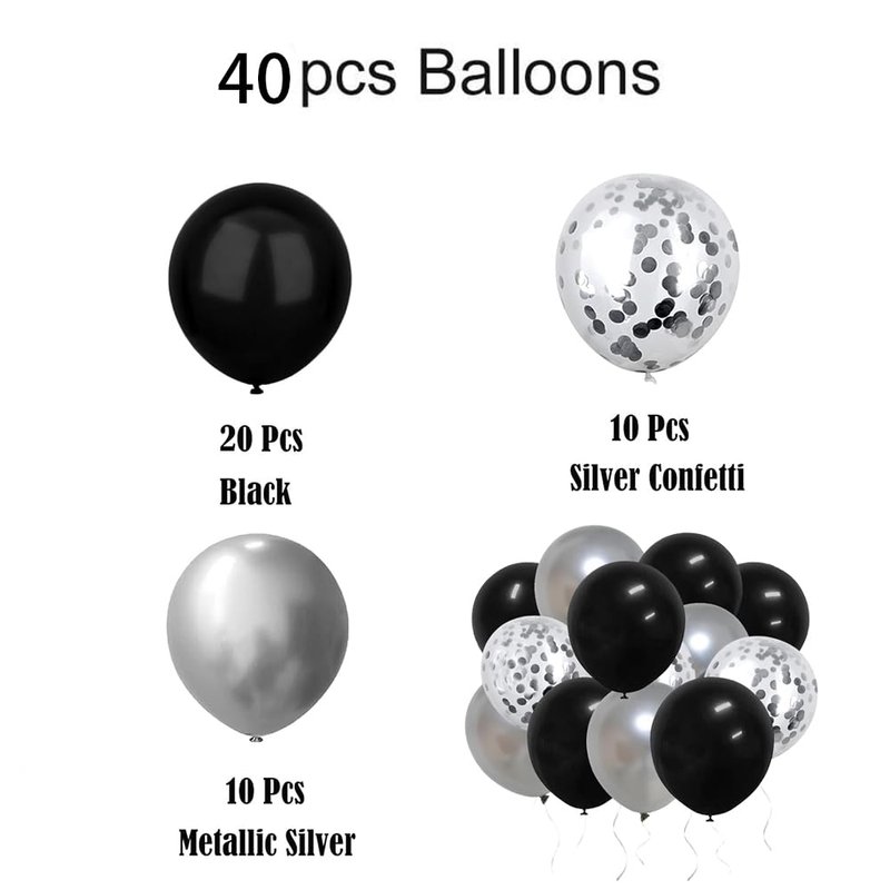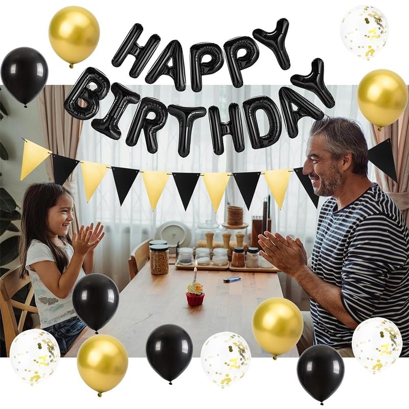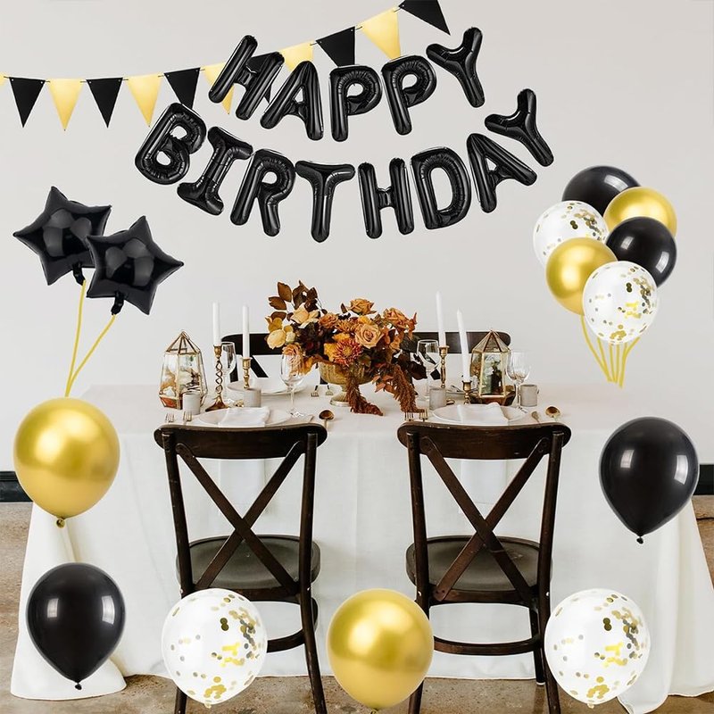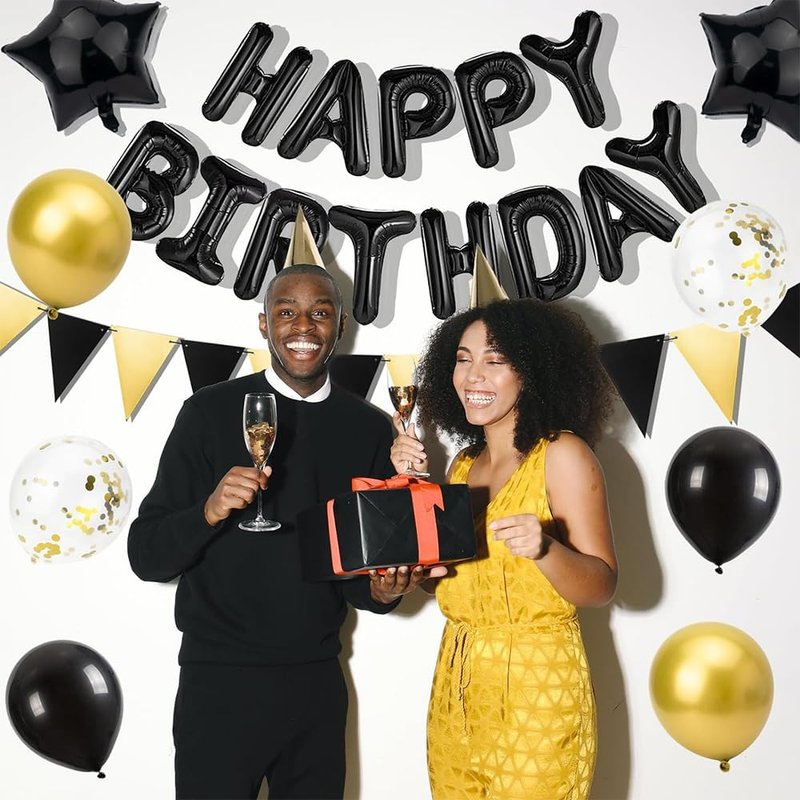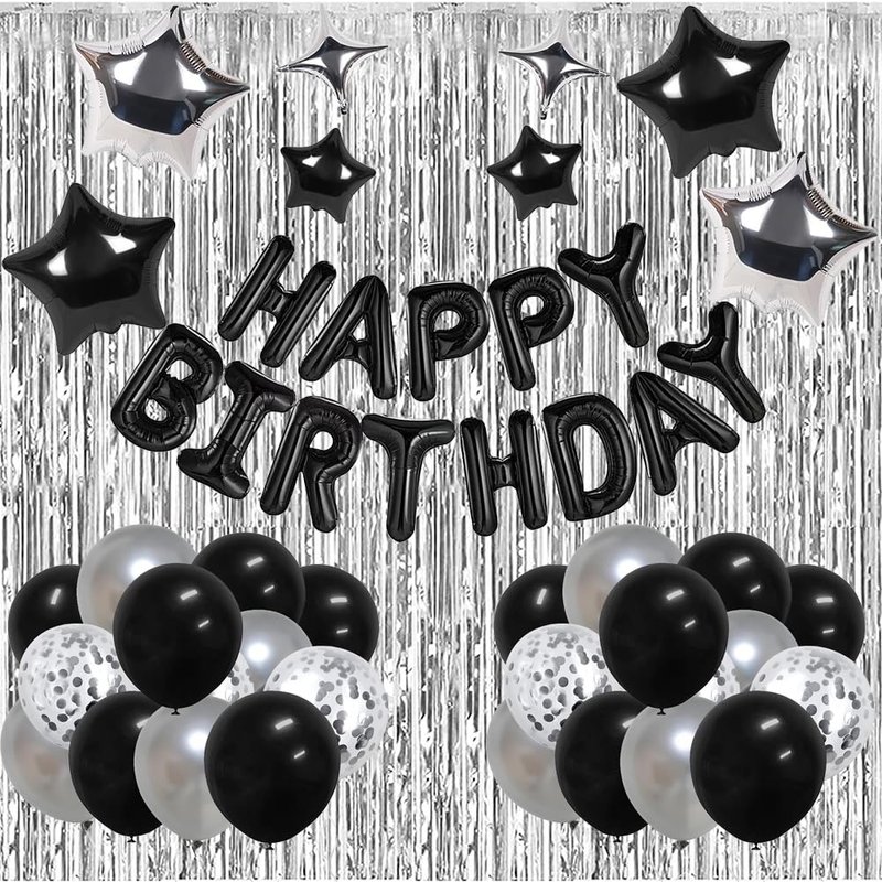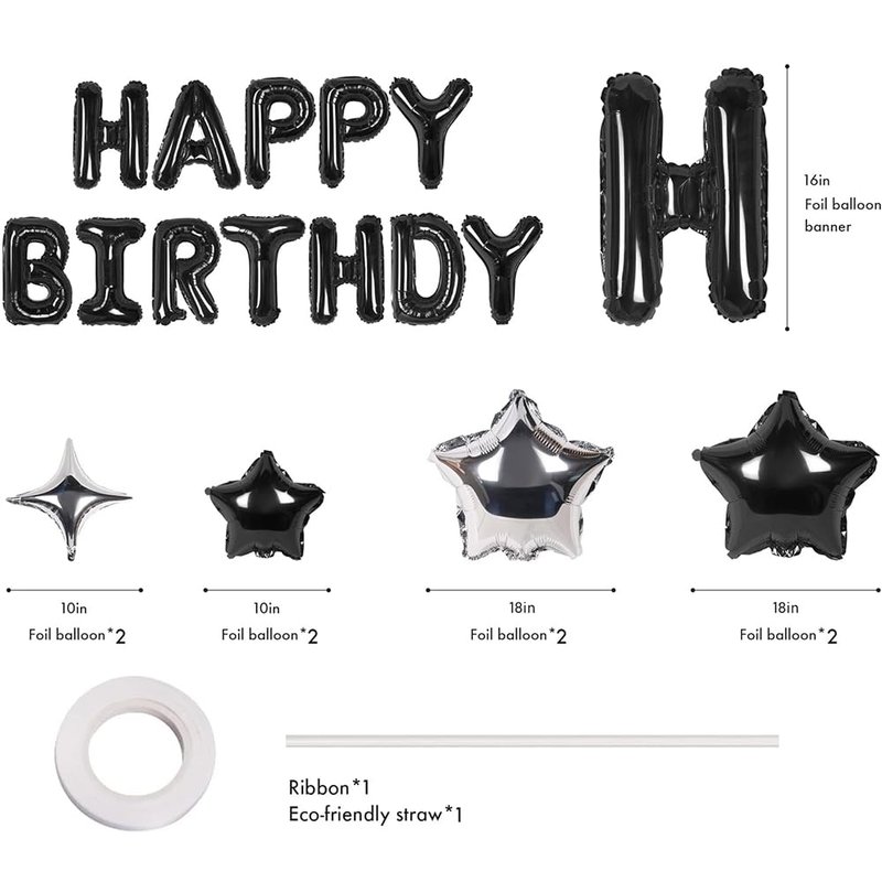 - π Black Birthday Party Decorations: This quality black birthday decoration set includes: Black Happy Birthday letters x13pcs(16in) + Silver four-pointed star x2pcs (10in) + Black five-pointed star x2pcs (10in) + Black five-pointed star x2pcs(18in)+Silver five-pointed star x2pcs (18in) + Silver foil fringe curtain x2pcs + 12" latex balloon x40 pcs + Plastic straw x1pcs + Ribbon x1pcs.