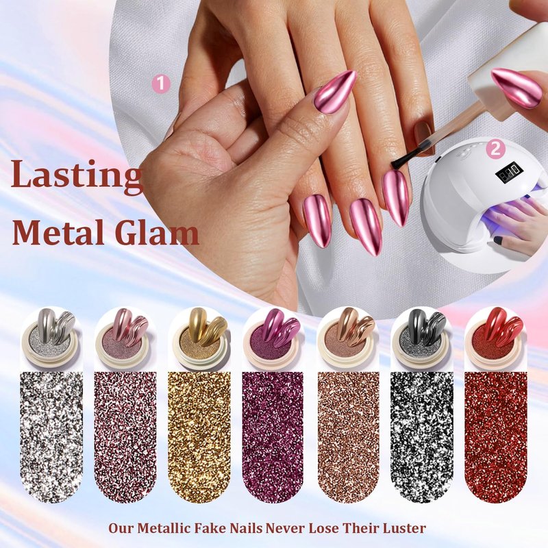 - 【To Get Beautiful Fast】With chrome glue on nails medium,you can skip the lengthy salon visits and tedious application processes.Within minutes,you'll have stunning mirror nails press on fake nails that will leave you feeling confident.These acrylic press on nails medium length come ready to wear,with no glue or nail polish required and no drying time.
