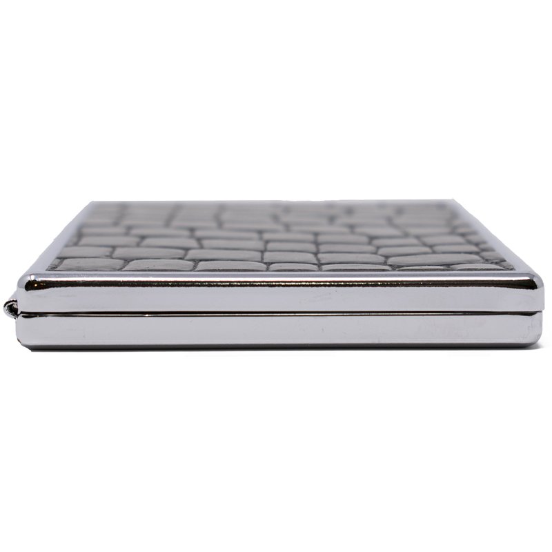 Featuring a classic crocodile print embossed on genuine leather, this metallic cigarette case is sturdy, corrosion resistant and will last you for years to come. Measuring 3" X 4.25", this compact case can accommodate 9 100s or Regular size cigarettes. Crush-proof, this cigarette case features a clip to secure your cigarettes and other smoking accessories. Extra sturdy hinges and a release button on the front ensure that your contents will remain safe and never get crushed. With both sides covered in leather, this case can comfortably slip into your pocket or bag. Great for credit cards, driver’s license, ID cards, cash and all types of smoking accessories. Looking for something else? We offer our cases in several sizes: From a regular sized cigarette case that accommodates a full pack to slightly smaller 16-count pack, a compact half-pack size and an ultra-compact size. We have cigarette cases for Regular Size, King Size, 100s and 120s and in both metallic and leather finishes. Don’t want to deal with clips? We also sell cigarette cases with elastic bands. Please see our other cigarette case listings for more options.