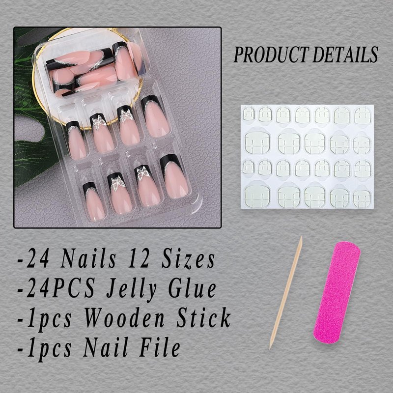 - 【Package Included】24pcs black french tip false nails, jelly glue, a wooden stick. (Jelly glue is not as durable as liquid glue, but it makes the false nails reusable. Please use suitable glue according to different scenes.)