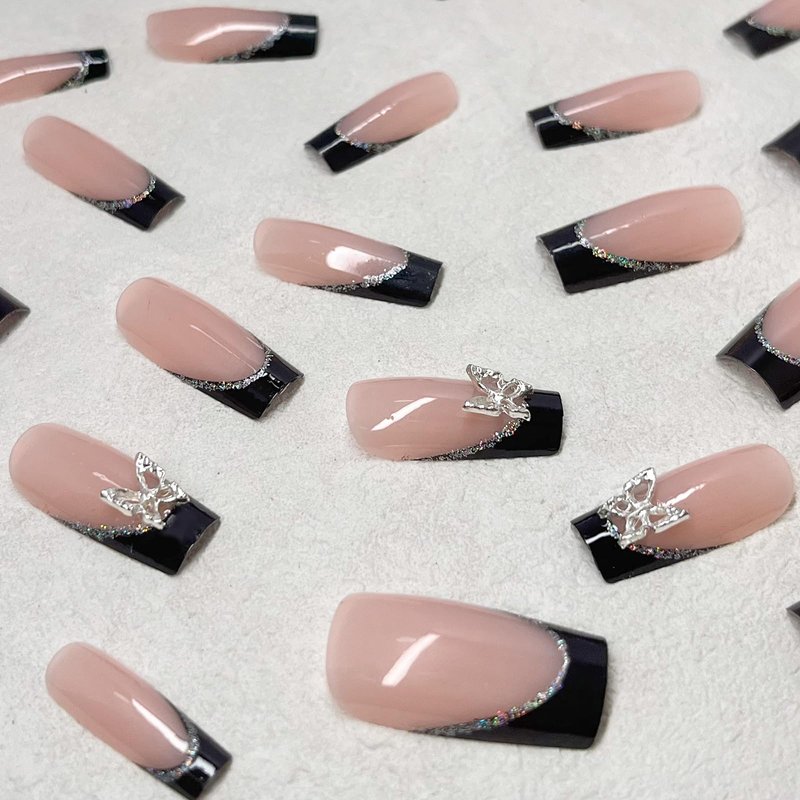 Black French Tip Press On Nails with butterfly nail charms, Fashion Full Cover Stick On Nails For Women Girls Tip Nail Art Decoration