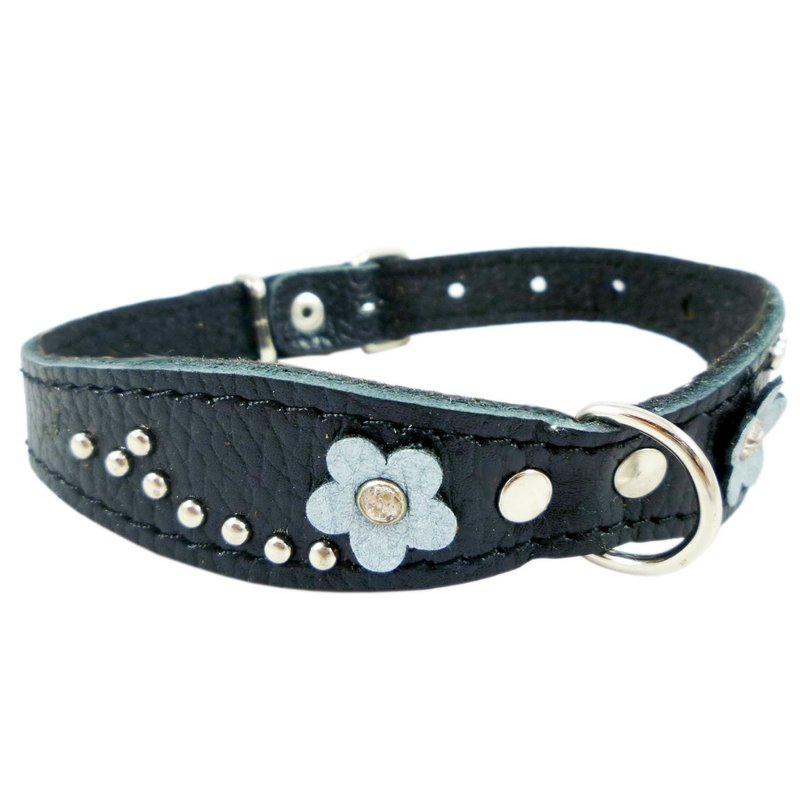 Black Genuine Leather Designer Dog Collar 11" x3/4" with Studs, Daisy, and Rhinestone