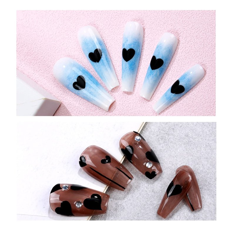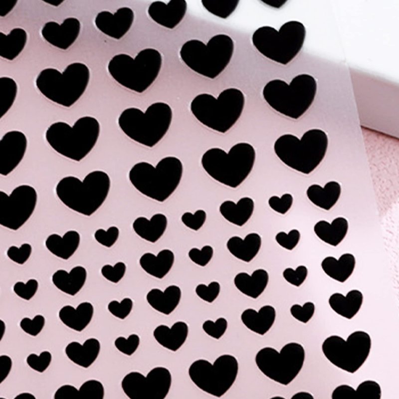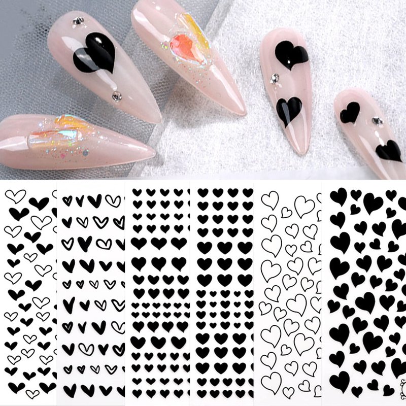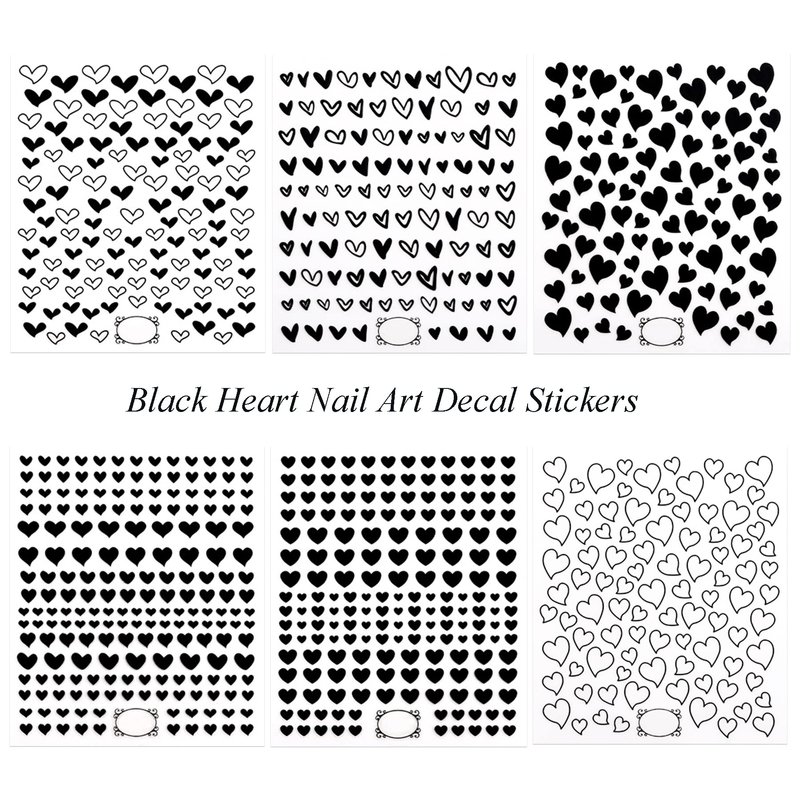 Black heart nail sticker set includes 6 sheets of heart nail decals of different designs. Blacks hearts designs are great for nail art designs and match well with other nail art supplies, so it is perfect nail art design choice for both fingernails and acrylic nails. These nail decal stickers are suitable for both women and girls kids.