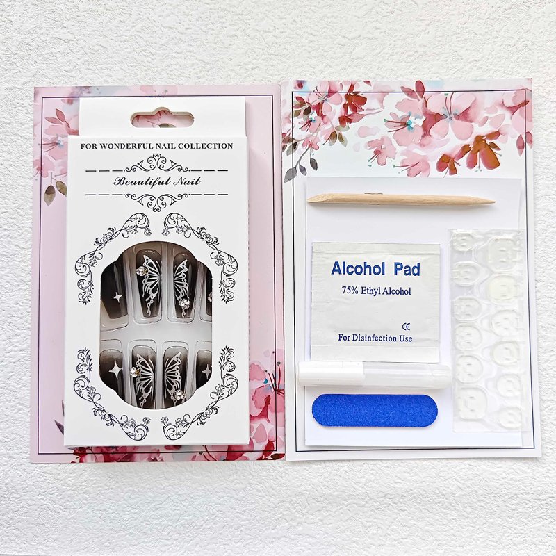 We focus on the design and sales of fashionable press on nails, pursuing to design fake nails comparable to salons.Customer satisfaction is our highest pursuit. If you have any questions or suggestions about our stick on nails, please contact us via Email, and we will do our best to give you a satisfactory answer as soon as possible. How to operate fake nails 1. Gently wipe the nail piece with a nail stick to remove the surface cuticle, rinse well and keep the nail clean and dry 2, Choose the size that best suits your nail, take the right amount of glue or free jelly glue and apply to the inside of the chosen nail piece 3、Press the fake nail on your nail and hold it for 30 seconds 4. Trim your nails according to the shape and length you want. How long does it last With the correct use of our products, it can last 1-2 weeks Keep away from water for 1 hour after applying the fake nail You can use other accessories to stick on your fake nails to create the style you like How to remove Soak your nails in warm water for a few minutes, then gently peel off the pre-glued nail from the side, remove the glue sticker and keep the tip of the fake nail for the next use. Caution Please do not leave the nail in water for a long time, it will make the nail easy to fall off. Please avoid prolonged contact with hot water and soap to prolong the life of the nail.