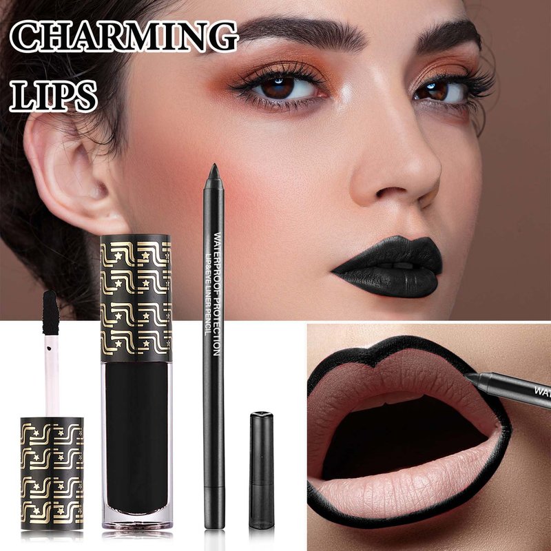 Black Matte Lipstick,2 Pcs Black Matte Lip Liner and Liquid Lipstick Set,Waterproof Long Lasting Lip Gloss Stain,Matte Liquid Lipstick for Women,Non-Stick Cup Non-Fading Liquid Lip Liner Lipgloss Set