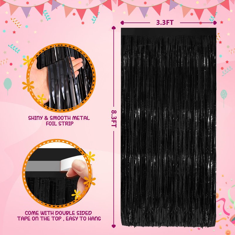 Black Metallic Tinsel Foil Fringe Curtains Backdrop 2Pack 3.3x8.3Ft Party Streamers for Birthday Party Decorations Halloween Christmas Decors Foil Curtain Backdrop for Bachelorette Bridal Party