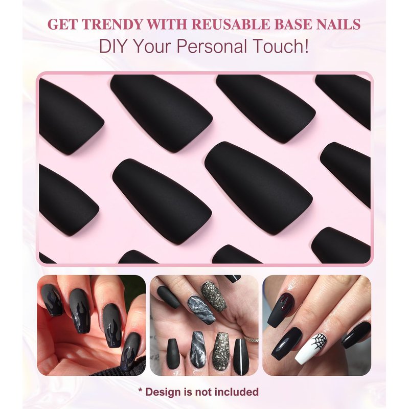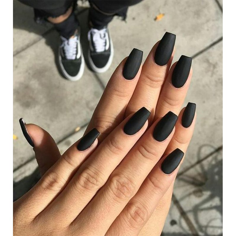 - All Black Long Coffin Nails - Feature a coffin shape and a velvety black finish, the long length adds chic and fashion to your look. Enhanced by a matte top coat gel process for long-lasting wear. Mix and match to create your unique style that complements every outfit, from everyday chic to glamorous party looks