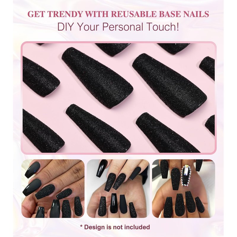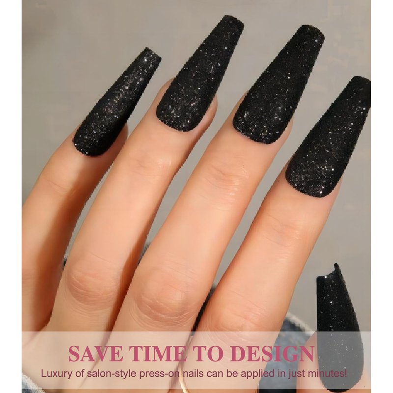 - Black Glitter Long Coffin Nails -These nails feature a long coffin shape and are adorned with shimmering black glitter for a captivating and eye-catching look. Make a bold statement with sleek and glamorous black glitter press on nails.