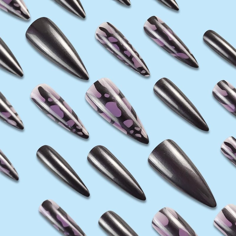 Black Press on Nails Long Almond - Summer Cute Fake Nails Purple False Nails Press ons Full Cover Nail Tips with Spider Web Shape Design Acrylic Nail Kit for Women 24 Pcs