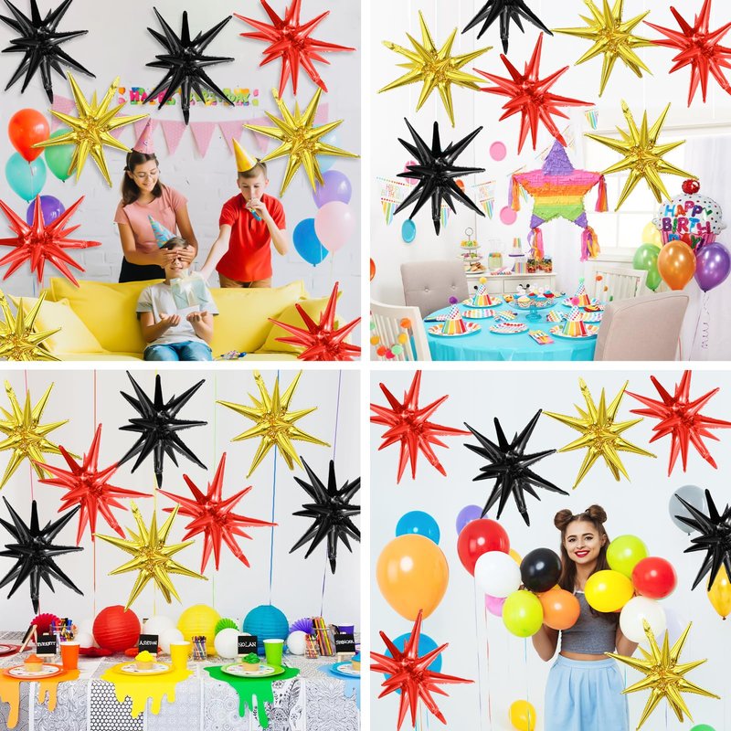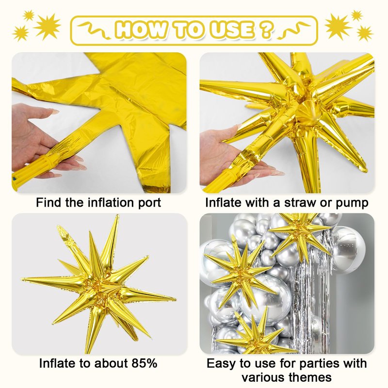 - Easy To Use:This star balloon set,the exploding star is a one-piece design,you don't need to assemble it again,you can inflate it by using the straw inside the package,it supports filling air or helium,the inflatable mouth adopts a self-sealing design,it is easy and convenient to inflate it,it can be better decorated in the place you need to create a vivid and unforgettable party.