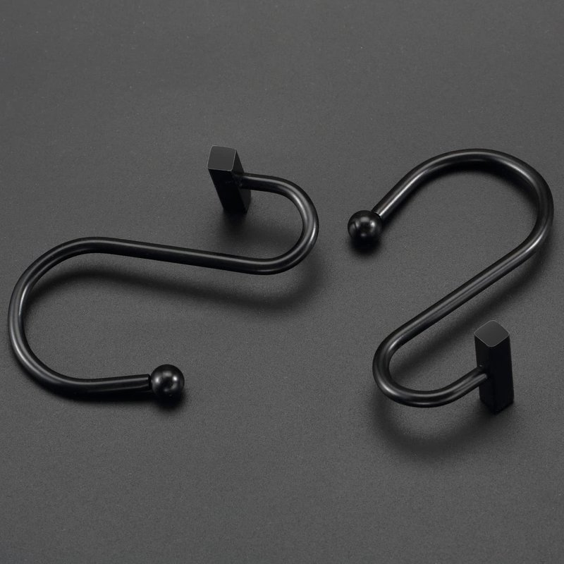 - MATTE BLACK SHOWER CURTAIN HOOKS - Modern style shower hooks make small upgrade in your bathroom goes a long way. The T shape designed hooks' end keep curtain stays on the rod and never fall, and the other end is ball shape which protect the shower rods from damage during use.