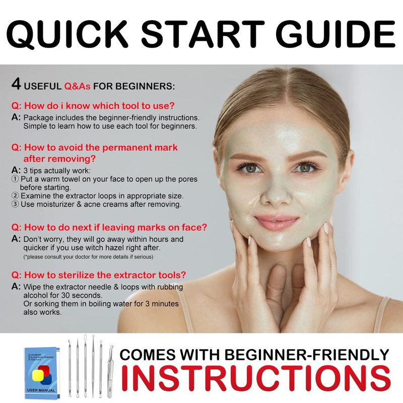 Easy to use. Before using, clean your face with cleanser, and clean the tools with warm water. Then poke the pimples with needles, and press rings to push the pimples out. If you are the first time to use this, please rest assured, it comes with easy-to-use user guide paper. You will become a beauty pro within few minutes at home!