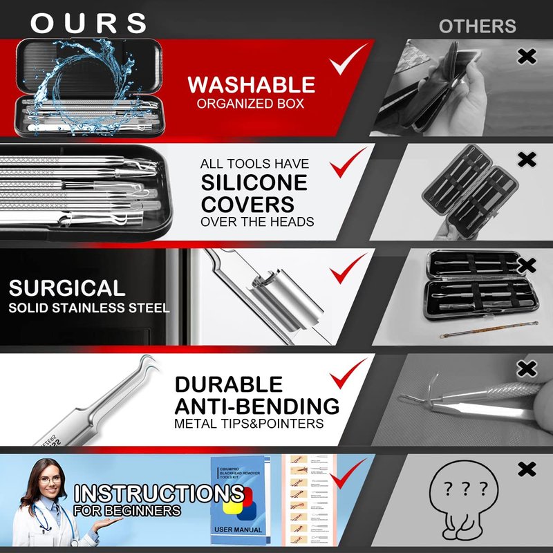 This blackhead remover kit is made of surgical stainless steel with ultimate strength. Waterproof, long last and durable. The sharp needle tips are well covered by silicone sleeves. Don't worry to hurt your hands. Besides, each tool will be positioned in an unique pocket slot of the carrying box. It is easy to store those sharp tools and keep them away from dirty room.