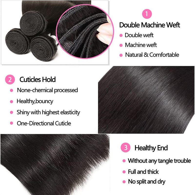 1)Hair Material:100% Brazilian virgin unprocessed healthy human hair.2)Hair Color: Natural black color,can be dyed and bleached.3)Hair Weight:95-100g/Bundle,10"-26" available.4)Hair Weft: Double machine made weft, No shedding.natural hair that can be curled, washed, colored and bleached.5)Closure: 8"-18",free part, middle part and three part.6)Lace Size:4"×4".7)Base Material:Swiss lace.8)Color of Lace:Medium brown.How to care for your human hair? Washing &care instructions1.Comb hair with brush or a wide comb to detangle.2.Wet hair with cool of warm water.3.Select an oil free shampoo to clean the hair. Do not use any regular shampoo.4.Gentley shampoo hair and rinse with tepid water.5.Use a detangling spray designed for weaves. Do not spray any type of aerosol oil sheen on the hair. If you desire a shine, use an oil free shine spray. Apply to the ends of the hair, gently comb through and style as desired.Our CompanyOur company has good human hair supplier and we have good experience in human hair weft items. We have our professional service team and strict quality control system to ensure our shipment and our service!Our Return Policy7 Days no satisfied we can return once you bought the hair. After you receive the hair and you want change the size, style or color, we can change it for you. But the hair should be new and no damage and the buyer must pay for the return fee.If we shipped wrong items and the hair is no damage, we accept return and we will pay for the cost for return.Kind Notes:For measure the hair length, please make sure the hair is stretched into straight, then measure the length.FAQQ:How many bundles should I use for a full head?A:For our suggestion,3 bundles is enough to make a full gead ,if you like thicker hair or the hair is long size ,we suggest you use 4 bundles. Hope the information is helpful for you.