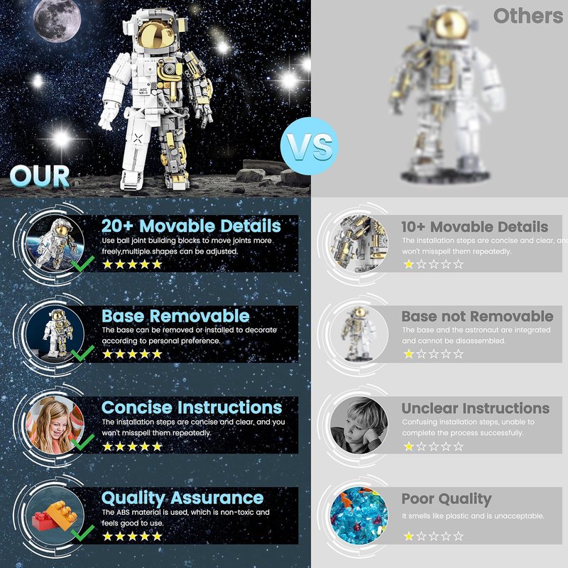 - 【Safe and durable construction】: Sturdy and durable materials provide stability, allowing the model to maintain its stance without any support. Made from high-quality ABS plastic, this astronaut set is safe for children to assemble. The smooth edges and burr-free pieces ensure a safe building experience.