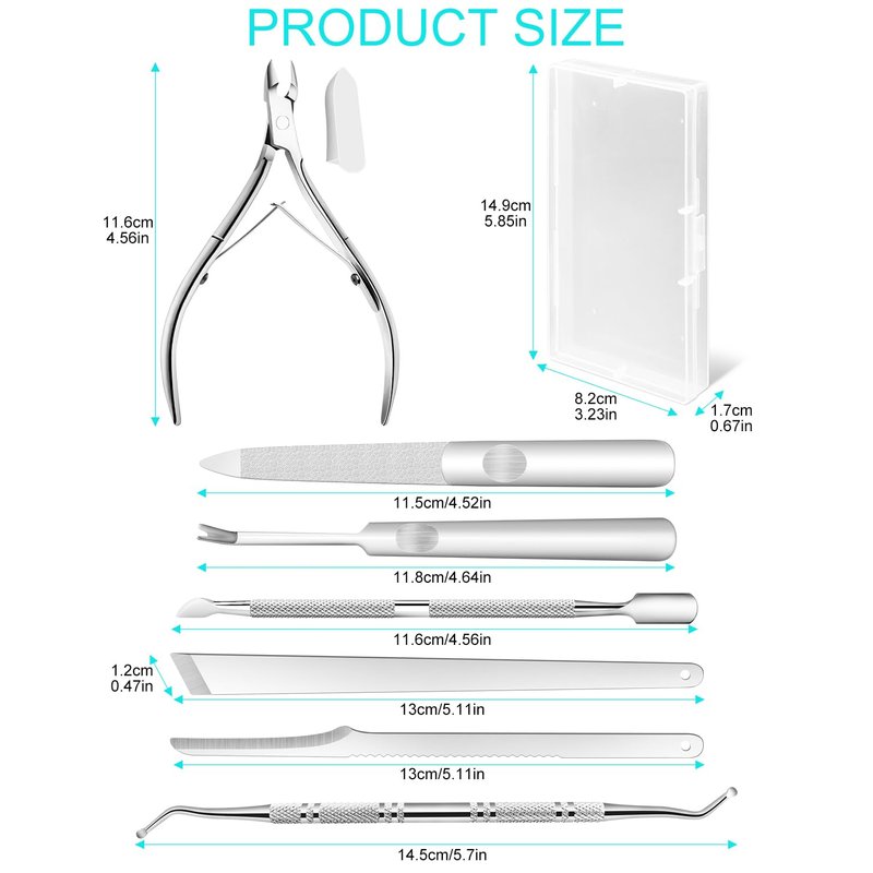 - 7-In-1 Pedicure Kit: This manicure set includes 7 essential tools for achieving healthy and beautiful nails. It includes a dual-ended endogenous toenail lifter, toenail file, dead skin fork, dead skin scissors, dual-ended nail dirt cleaner, angled pedicure blade and zigzag pedicure blade. Each piece has its own function and will definitely meet your requirements and fulfill your needs.
