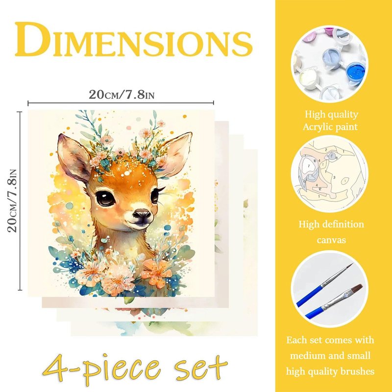 - Kids paint by number kits: Each kits comes with pre-printed cute animals picture textured canvas (6x6 inch,no frame)*4, high-quality brushes*8, hook nails*8,acrylic paints*4. Your child can create paint by number artwork, stimulating creative abilities
