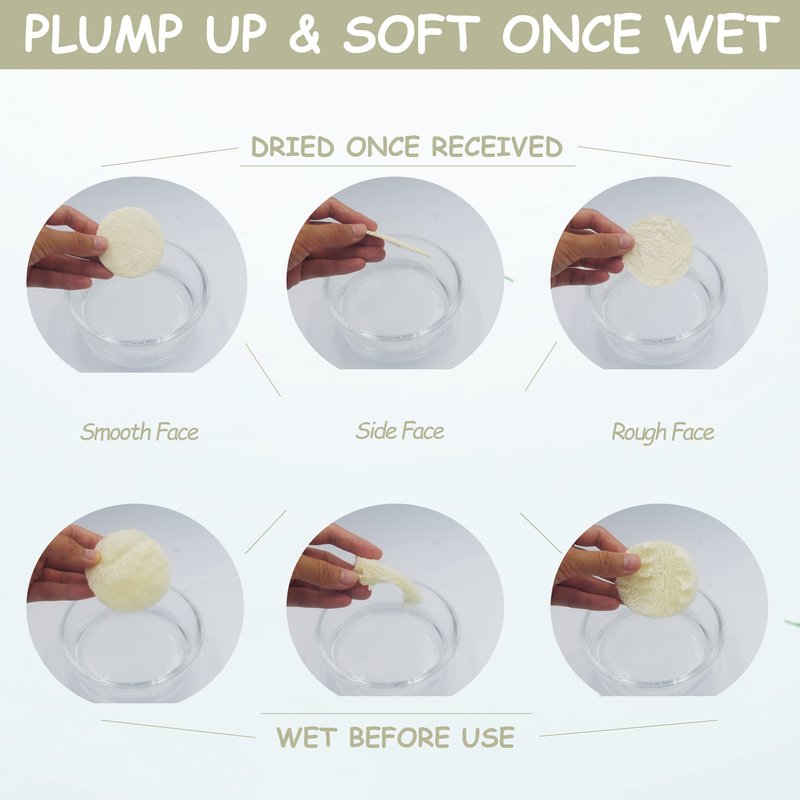 Soak in water to become soft before using, and then apply few facial cleanser or shower gel in loofah pad, using 3-4 figures to hold the loofah facial pad for washing.