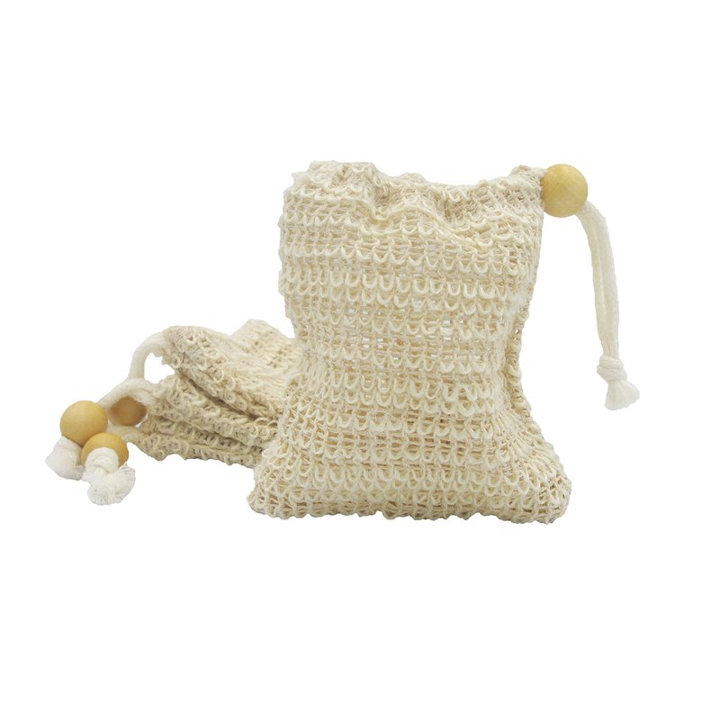 Bleu Bath (4 Pack) Exfoliating Loofah Pouch Sisal Ramie Soap Saver Bag with Drawstring and Wooden Bead Holder
