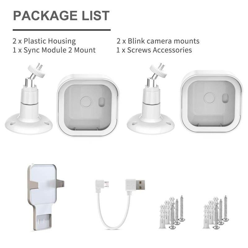 - 【Package Contains】2 x Blink camera mounts, 2 x Plastic protective housing, 1 x Wall mount for Blink Sync Module 2. 1 x Screws accessories. If you have any issues about this product, please feel free to contact us.