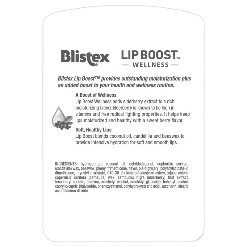 Wellness. New! Intensive hydration from coconut oil & beeswax. Blistex Lip Boost provides outstanding moisturization plus an added boost to your health and wellness routine. A Boost of Wellness: Lip Boost Wellness adds elderberry extract to a rich moisturizing blend. Elderberry is known to be high in vitamins and free radical fighting properties. It helps keep lips moisturized and healthy with a sweet berry flavor. Soft, Healthy Lips: Lip Boost blends coconut oil, candelilla and beeswax to provide intensive hydration for soft and smooth lips. Satisfaction guaranteed. Card is 100% recyclable.