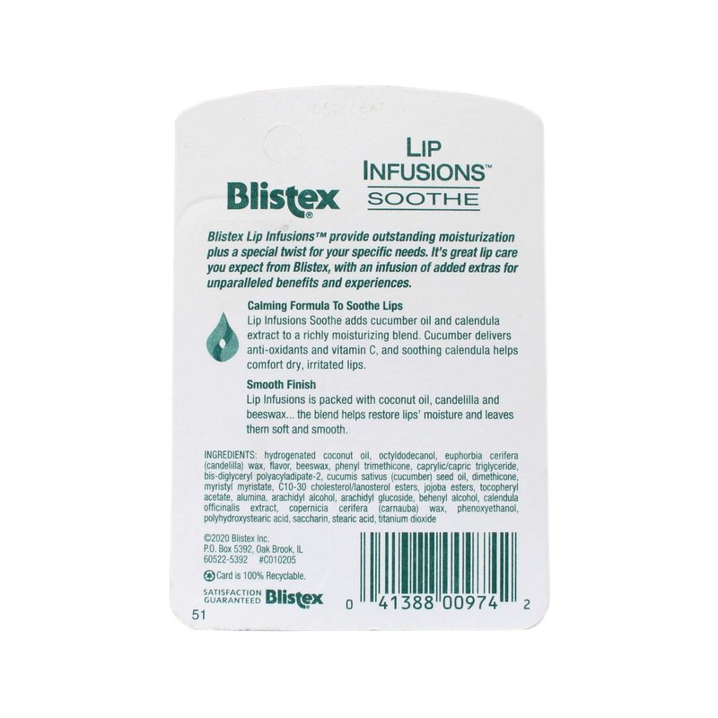 New! Cucumber & calendula to comfort irritated lips. Natural beeswax & candelilla to moisturize and comfort. Comforting. Blistex Lip Infusions provide outstanding moisturization plus a special twist for your specific needs. It's great lip care you expect from Blistex, with an infusion of added extras for unparalleled benefits and experiences. Calming formula to soothe lips. Lip Infusions Soothe adds cucumber oil and calendula extract to a richly moisturizing blend. Cucumber delivers anti-oxidants and vitamin C, and soothing calendula helps comfort dry, irritated lips. Smooth finish. Lip Infusions is packed with coconut oil, candelilla and beeswax - the blend helps restore lips' moisture and leaves them soft and smooth. Satisfaction guarantee. Card is 100% recyclable.