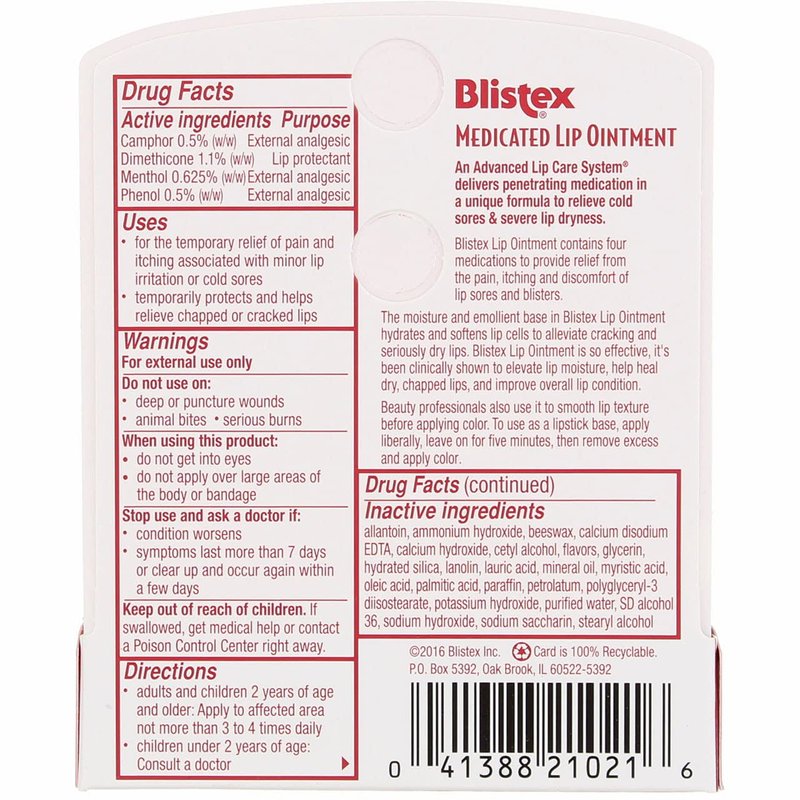 - Serious Relief: Blistex Lip Ointment contains 4 medications to provide relief from the pain, itching and discomfort of lip sores and blisters