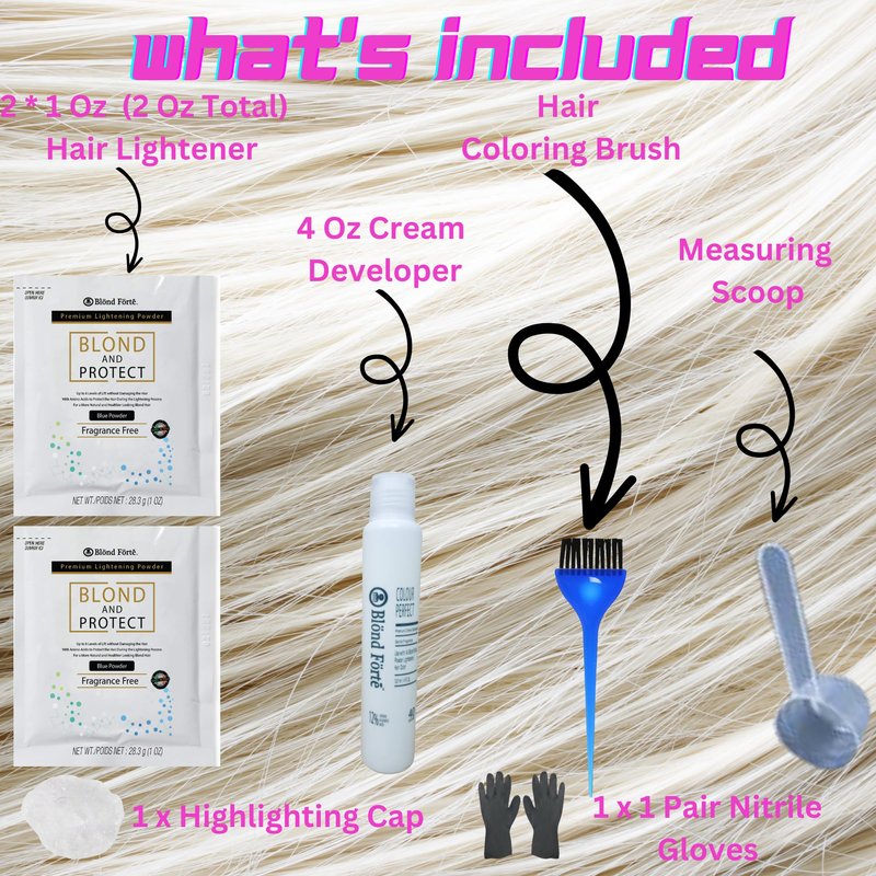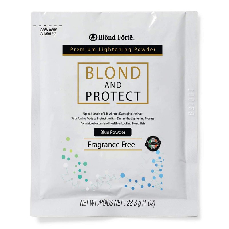 The Blond & Protect Dust Free Premium Hair Lightener has up to 8 levels of lift. Its powerful defensive complex restores and strengthens weak and damaged hair structure during the bleaching/lightening process. With an innovative formulation, Polyamino Sugar Condensate (PSC) protects the hair during the entire application process, leaving the hair healthy and soft. Additionally, PSC does not interfere with the lightning performance of the powder, which allows the user to achieve 8 levels of lift. Blond and Protect Bleaching/Lightening Powder strengthens the inter cellular cement of the hair structure, normalizes lipid levels making the hair becomes more resistant to damage and environmental influences. The Blond & Protect Dust Free Premium Hair Lightener is part of a line of professional hair products that are trusted by professionals around the globe. Blond Forte’s gentle yet professional-grade formulations is a staple for stylists internationally. When you purchase Blond Forte products, you can be confident that you are purchasing a product that is free of unnecessary harsh ingredients. Blond and Protect is an ultra lightening powder that hairstylists have been waiting for! The ultimate solution for hairdressers, hairdressers can now highlight and condition with one product. Items Included in this Offer: 17 Ounce (1.1 LBS) Hair Bleach/Lightener (Made in Italy) | 13.5 oz/400ml Premium Creme Developer | 1 Pc Hair Coloring Brush for Hair Dye or Hair Bleach | 1 Pair Nitrile (latex-free) Gloves | 1 Salon Processing Cap