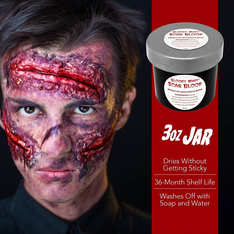 - 🧛𝗥𝗲𝗮𝗹𝗶𝘀𝘁𝗶𝗰 𝗔𝗽𝗽𝗲𝗮𝗿𝗮𝗻𝗰𝗲: A scab is a hard, dried blood clot that can form over a cut or broken skin to stop bleeding. BLOODY MARY Fake SCAB Blood creates a convincingly realistic blood clot effect, perfect for adding authenticity to cosplay, horror costumes, theater productions, and scary Halloween decorations. A creepy clown costume, vampire stuff, bloddy gloves, bloddy shirt or a fake knife blood will not be complete without faux blood!