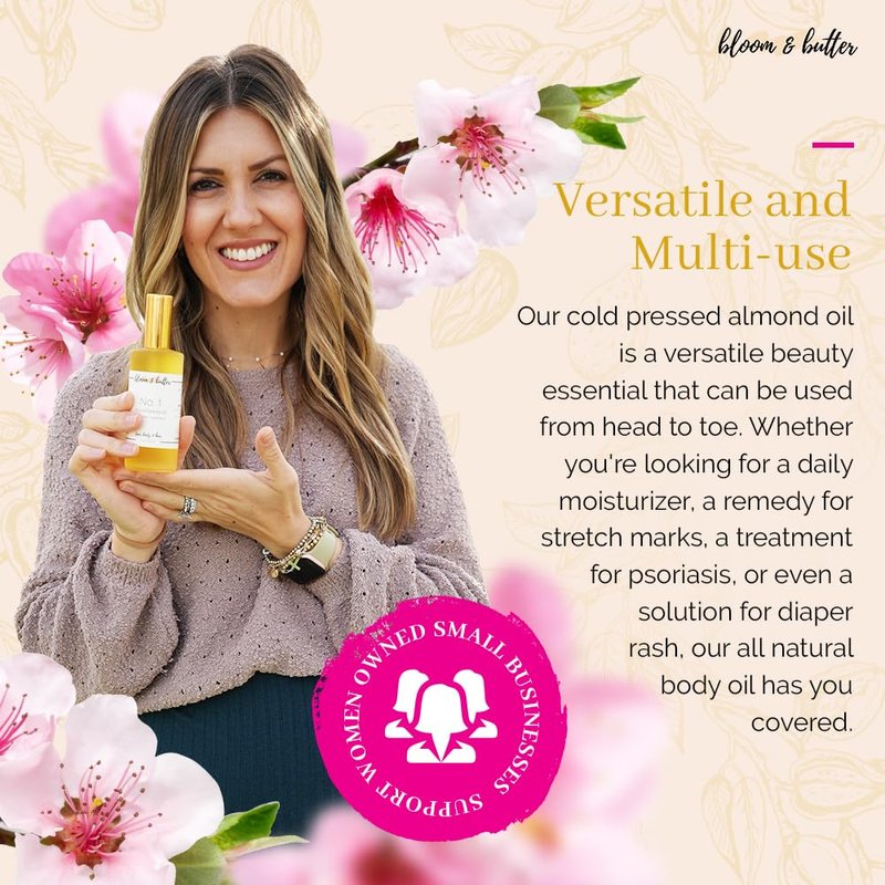 - VERSATILE AND MULTI-USE: Our cold pressed almond oil is a versatile beauty essential that can be used from head to toe. Whether you're looking for a daily moisturizer, a remedy for stretch marks, a treatment for psoriasis, or even a solution for diaper rash, our all natural body oil has you covered.