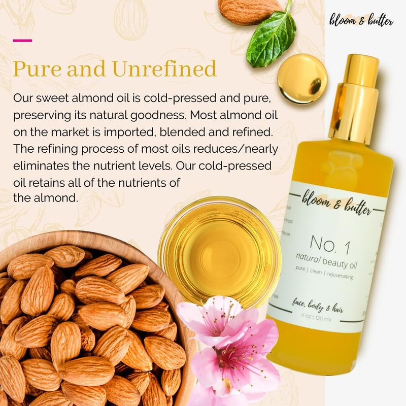 - PURE AND UNREFINED: Our sweet almond oil is cold-pressed and pure, preserving its natural goodness. Most almond oil on the market is imported, blended and refined. The refining process of most oils reduces/ nearly eliminates the nutrient levels. Our cold-pressed oil retains all of the nutrients of the almond.