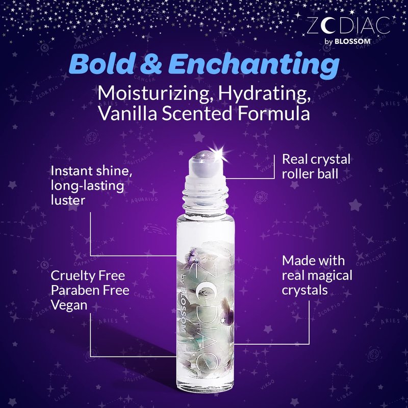 Blossom Zodiac Sign Roll-On Lip Gloss, Vanilla Scented + Moisturizing with Crystals, Made in USA, 0.20 fl. oz./5.9ml, Virgo