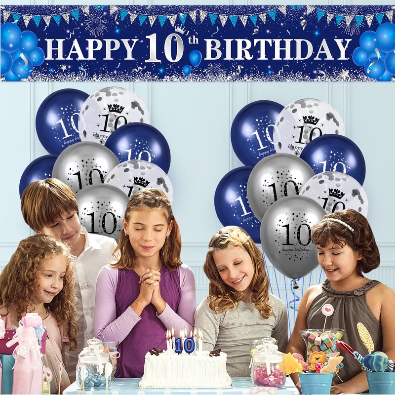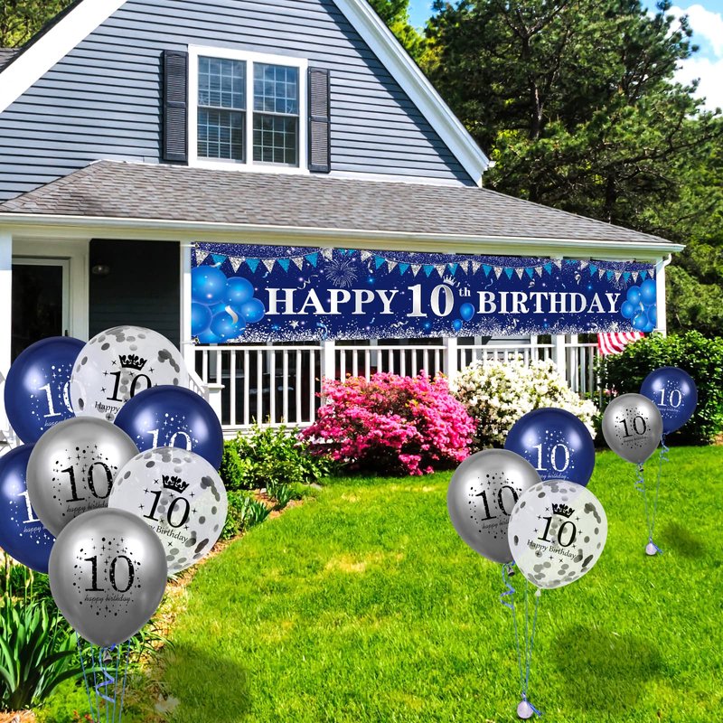 - Blue 10th Birthday Yard Decorations: you will get a blue and silver Happy 10th birthday banner, 18 pieces of latex birthday balloons with a ''10th'‘, ''Happy Birthday'' pattern. It would be an impressive decoration for 10 Years Old birthday party, a 10th-anniversary birthday party
