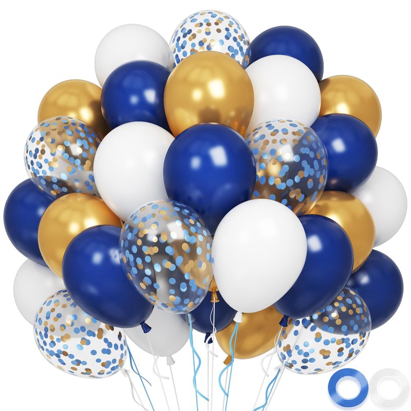- Blue and Gold Birthday Balloons Set: The 60-Piece Blue Gold Balloon Set for Birthday Party with 12 Inch Balloons include 22 x Matte White Balloon, 22 x Navy Blue Balloon,10 x metallic gold Balloon, 6 x Confetti Balloon, 2 x Band. It will definitely make your party unique and leave a deep impression on your guests.