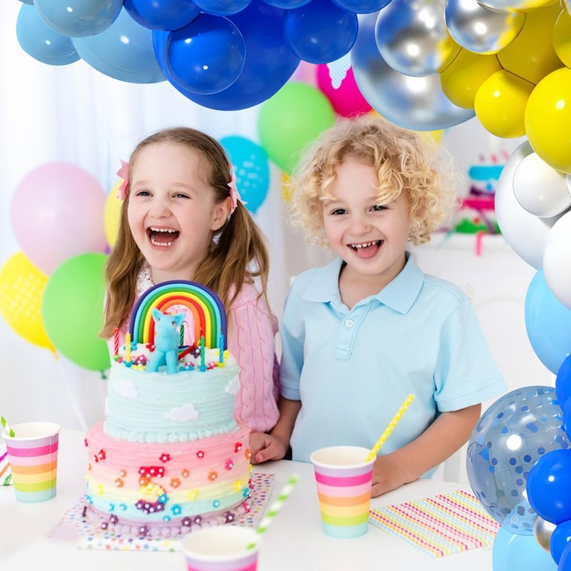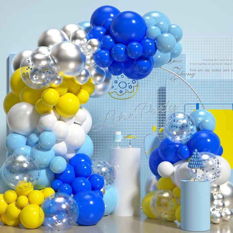 - 【Royal Blue Balloon Arch】The blue balloon arch kit include:12"(royal blue+pastel blue)*20pcs,12"(white+yellow)*15pcs,12"(confetti blue+metallic silver)*10pcs,5"(royal blue+pastel blue+white+yellow+metallic silver)*10pcs,0m ribbon* 1,100 dots glue*1,5m balloon tape*1.a complete party decoration