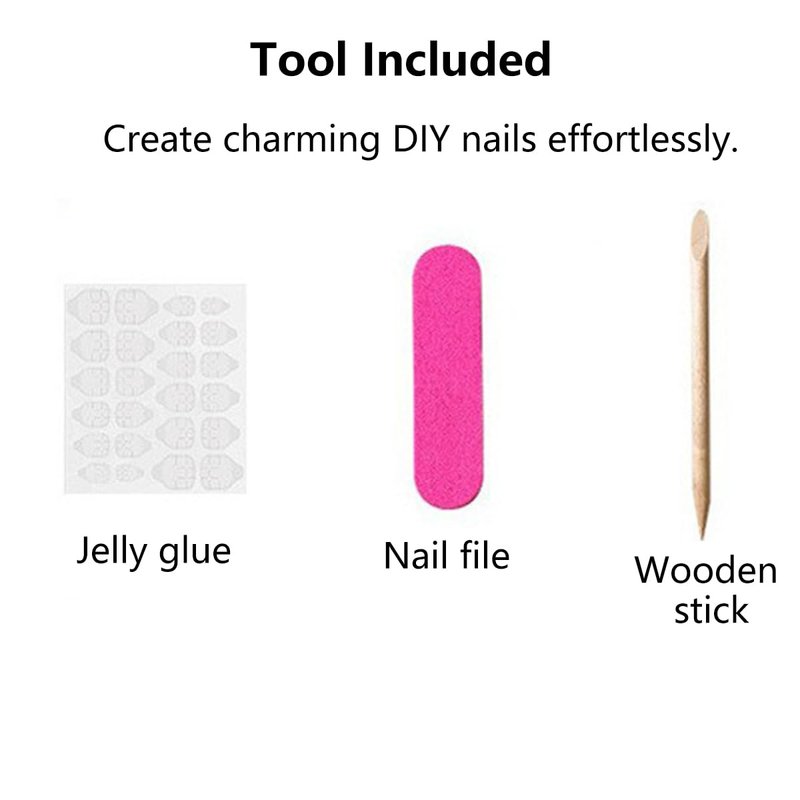 • 【Package】 1 Box 24 PCS, 12 Different sizes, that fits your every finger. Also includes 1 adhesive tab, a cleansing piece, a wooden stick, and a nail file, don’t need to purchase anything else. (Tips: Jelly glue can last about 3 days or more, glue remains longer)