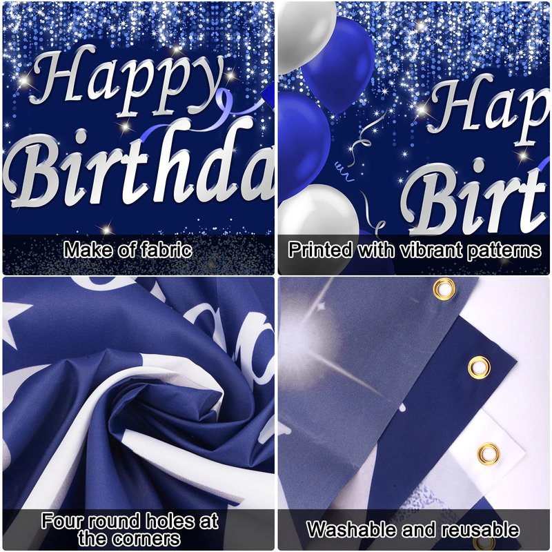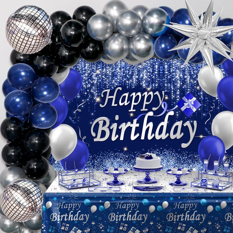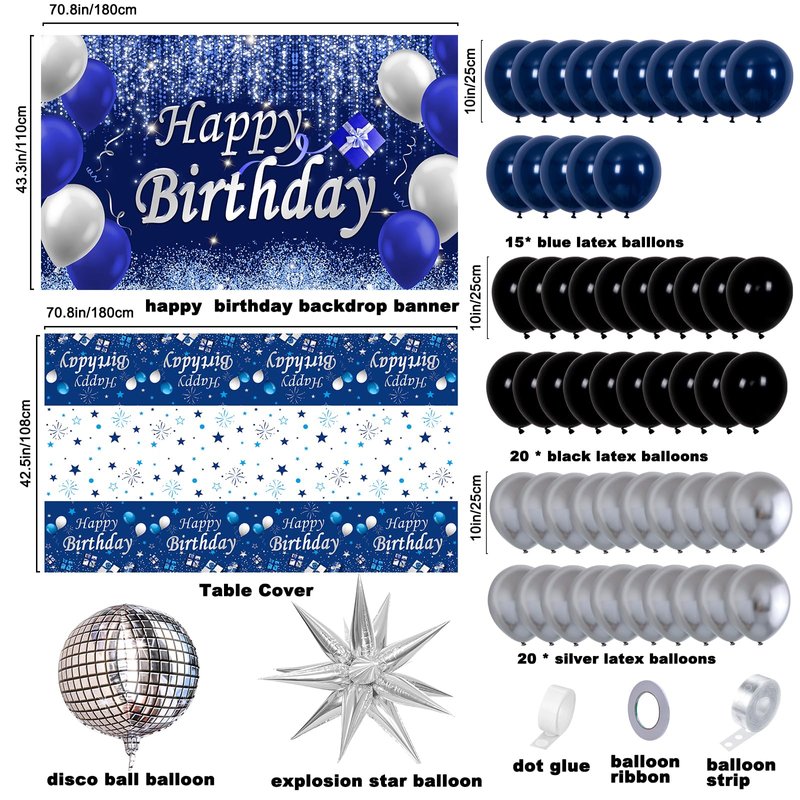 - 🎉Birthday decorations for Men & Women: The party supplies included happy birthday backdrop banner(70.86"*43.3"), happy birthday table cover(70.86"*42.52"), 15pcs blue latex balloons(10"), 20pcs silver latex balloons(10"), 20pcs black latex balloons(10"),1pcs silver explosion star balloons, 2pcs disco ball balloons(22"), 10 meters ribbon and a straw.