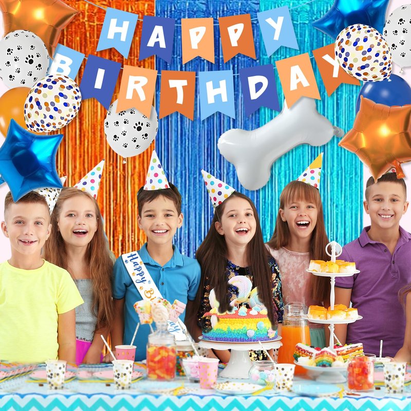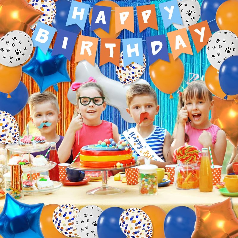 - A Nice Combination: Our blue birthday party decorations include 14pcs of blue and orange latex balloons, 2pcs of white latex balloons printed with dog paws, 5pcs of confetti balloons, 1pc of bone foil balloon and 4pcs of star foil balloons, a sash printed with "Happy Birthday" and dog paw and a fringe curtain in 3 color. These blue birthday party decorations are an all-in-one package that will keep your party lively and fun.