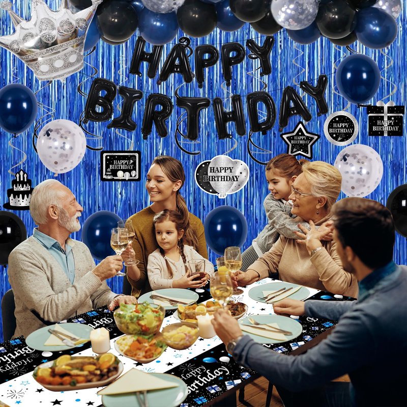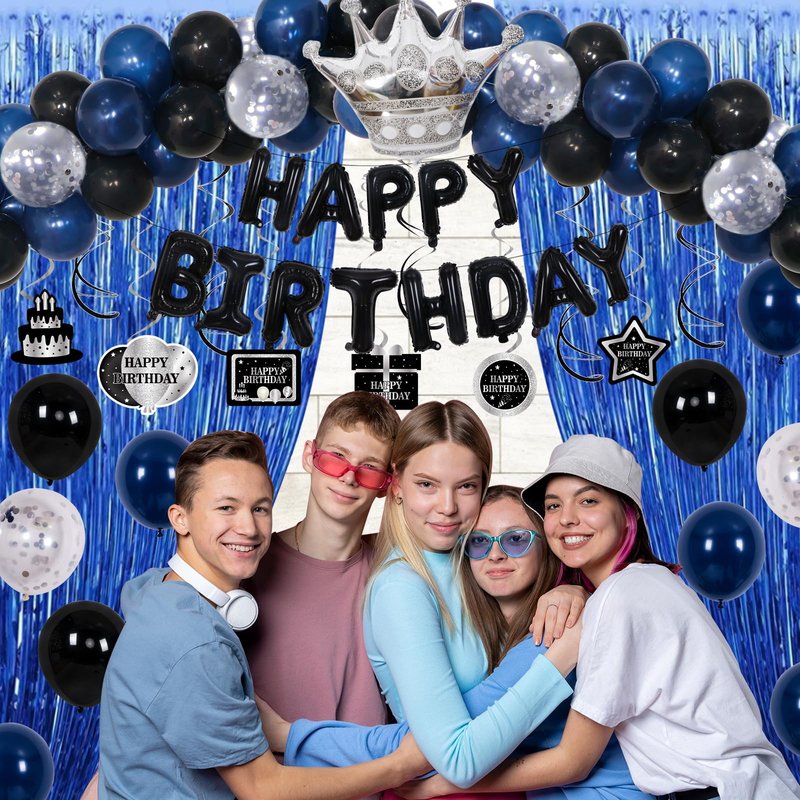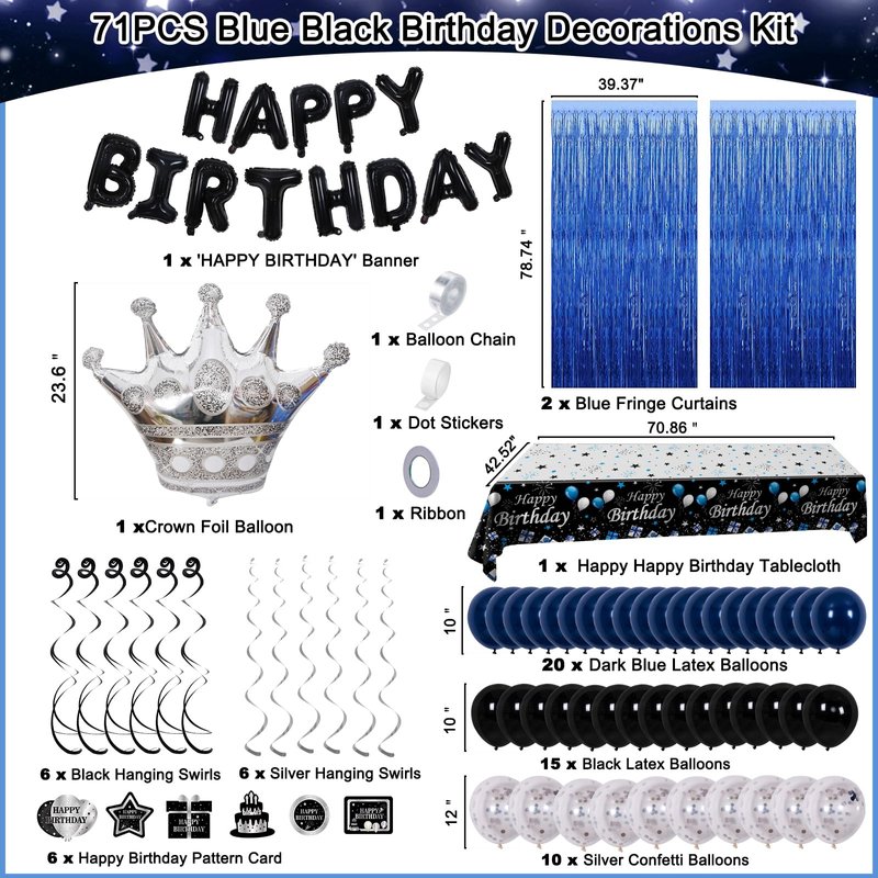 - 💙 Mens Birthday Decorations - 71PCS Great Value birthday party decorations kit includes 1 x black HAPPY BIRTHDAY Balloons banner, 2 x blue fringe curtains, 1 x birthday tablecloth, 6 x happy birthday pattern card, 6 x black hanging swirls, 6 x silver hanging swirls, 20 x 10” dark blue balloons, 15 x 10”black balloons, 10 x 12” silver confetti balloons, 1 x 12” crown foil balloon, 1 x balloon chain, 1 x dot stickers, 1 x ribbon.