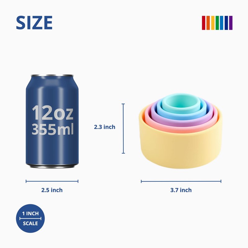 - Size - Each set has five 1.77 inch deep cups with a soft and easy-to-grip matte finish. The largest cup measures 3.7 inches in diameter, and the smallest cup measures 1.73 inches in diameter. Note: the two biggest cups have air holes.