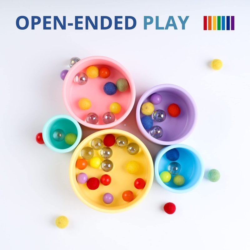 - Nest, Stack and Play - Build it up and knock it down. Silicone rainbow stacking and nesting cups are durable, versatile and ideal for open ended play, helping little ones work on motor skills and color recognition through play.