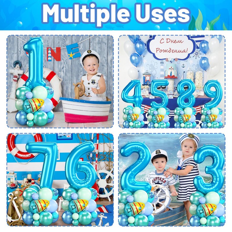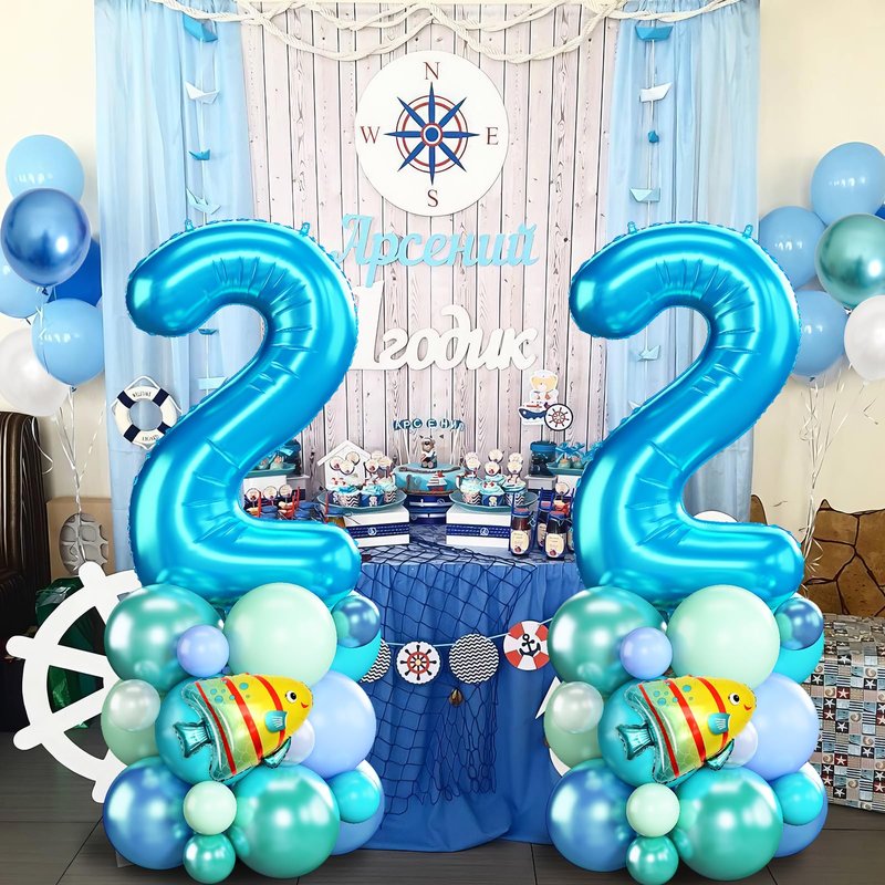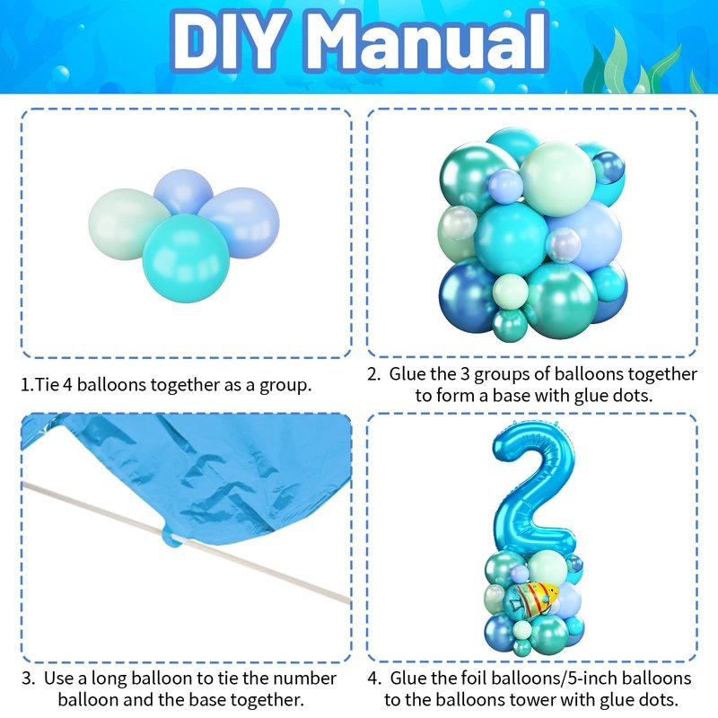 - 🎈Package Includes - Blue green ocean number 2 balloon tower set includes 1 pc 40 Inch light blue number 2 foil balloon, 3 pcs mini foil balloons (octopus , bubble fish, shark), 12pcs 12 inch balloons (3 pcs metallic blue, 3 pcs metallic green, 2 pcs teal blue, 2 pcs macaron blue, 2 pcs macaron green), 12 pcs 5 inch balloons (3 pcs metallic blue, 3 pcs metallic green, 3 pcs teal blue, 3 pcs pearl white), 1 pc white long balloon, 2 sheets of dot glue, 1 pc ribbon (10M), 1 pc instruction manual.