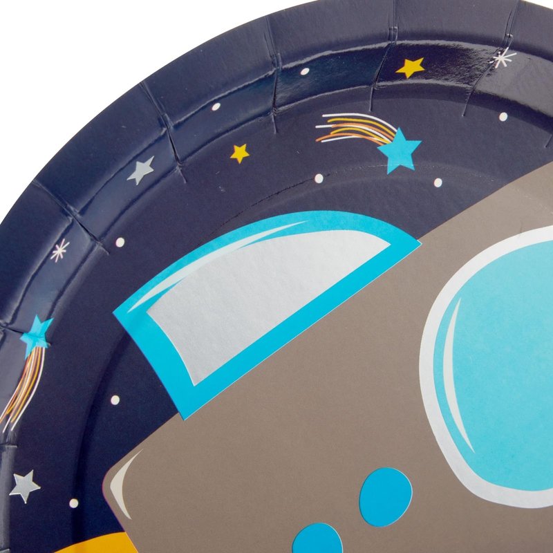 Elevate your dining and dessert tables with this party plate set that includes 48 space plates. The decorative rocket ship and galaxy design will perfectly complement your space birthday decorations for an upcoming space-themed party. Each blue plate measures 9 inches and has a sizeable amount of space for all of your favorite food and snacks. The sturdy paper construction ensures food remains on your plate without easily folding or breaking. Spend more time celebrating and less time cleaning up. Disposal is a hassle-free task with these party paper plates! Warning. Do not Microwave.